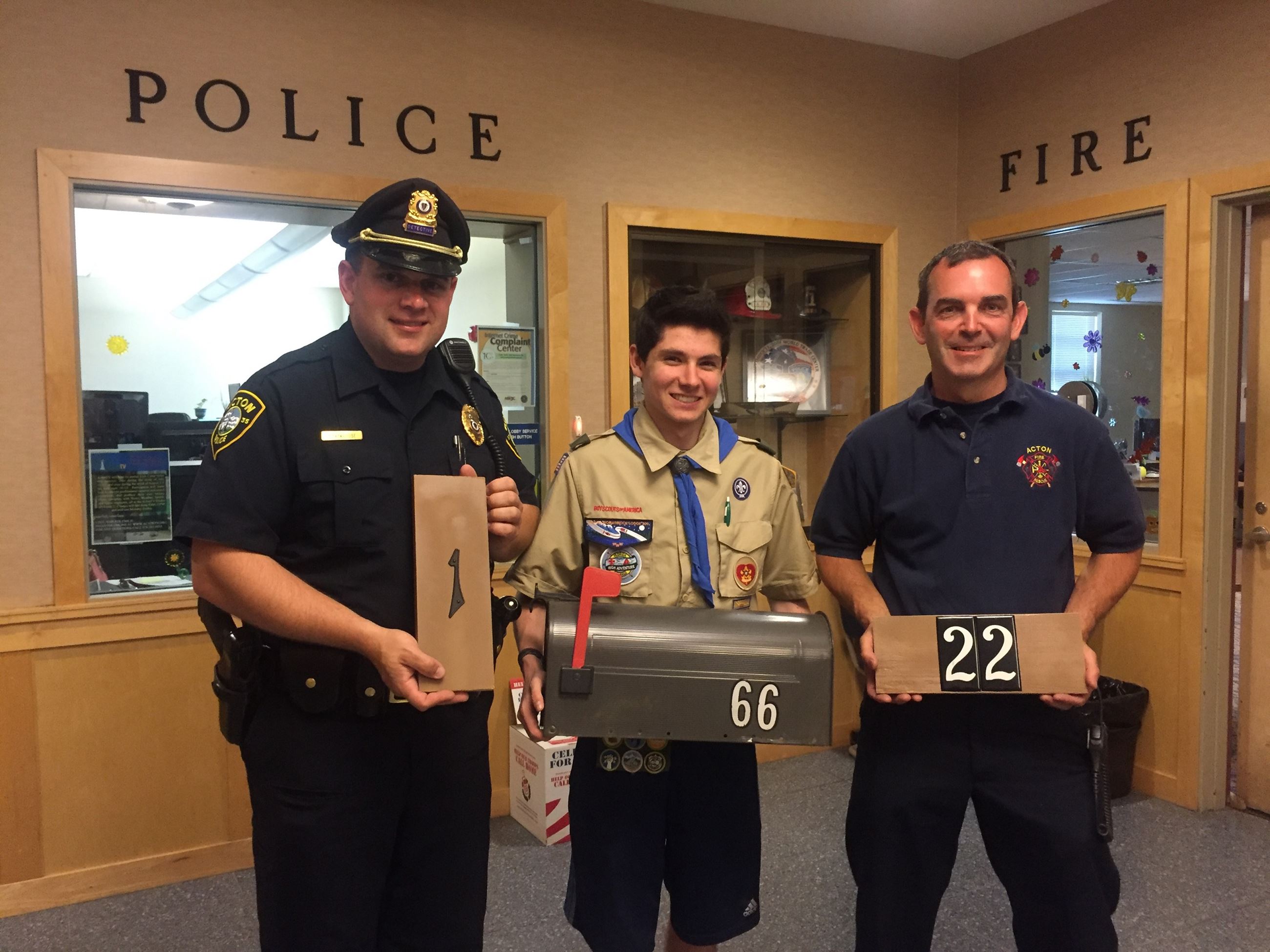 Pictured from left to right: Officer Jon Stackhouse, Eagle Scout Candidate Jason Lucas (Troop 32 Acton), and Firefighter Brent Carter.