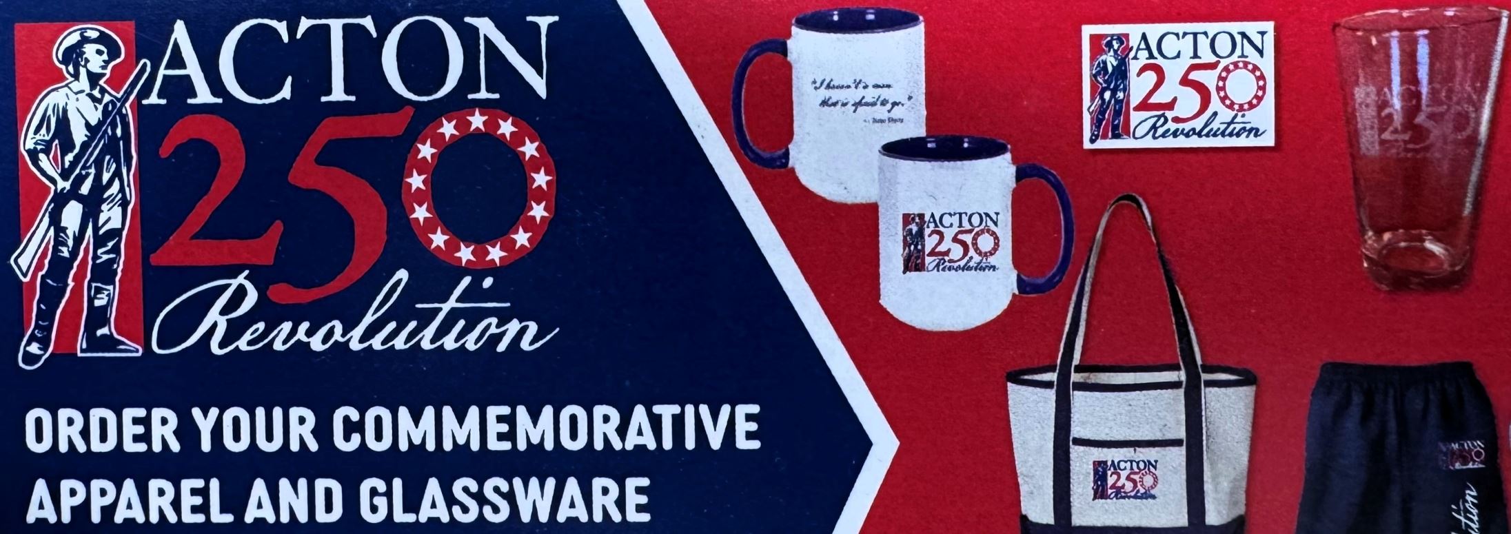 A portion of the proceeds of all sales made at the Acton 250 Store will fund our Acton 250 programming. If you would like to contribute a donation to support the Acton250 Committee's programming, please make out a check payable to "Town of Acton" and drop-off at the Town Clerk's office with note attached as follows: "Donation from [name/organization] with the amount total that you are donating and define the purpose of your donation:  "To support Acton 250 Committee programs and activities to be deposited in the Acton 250 Gift Fund."