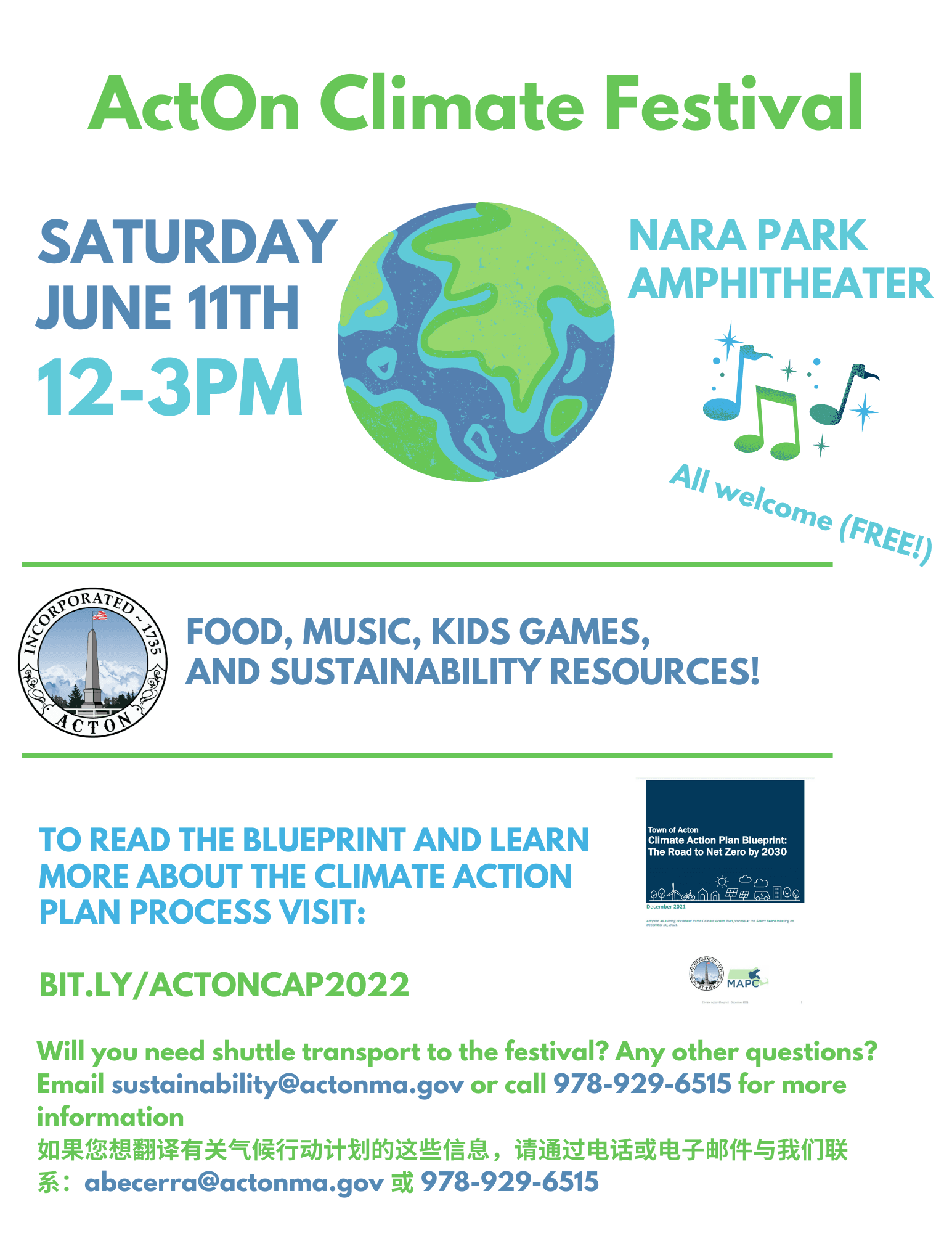 Join us for an exciting celebration of the CAP process at the ActOn Climate Festival, happening Saturday, June 11th, 12:00 - 3:00 PM at the NARA Park Amphitheater! There will be lawn games, food trucks, and sustainability resources to start putting our actions into work. Please let us know if you will need a shuttle to and from the event. You can reach the sustainability office at sustainability@actonma.gov or call the office at 978-929-6515.