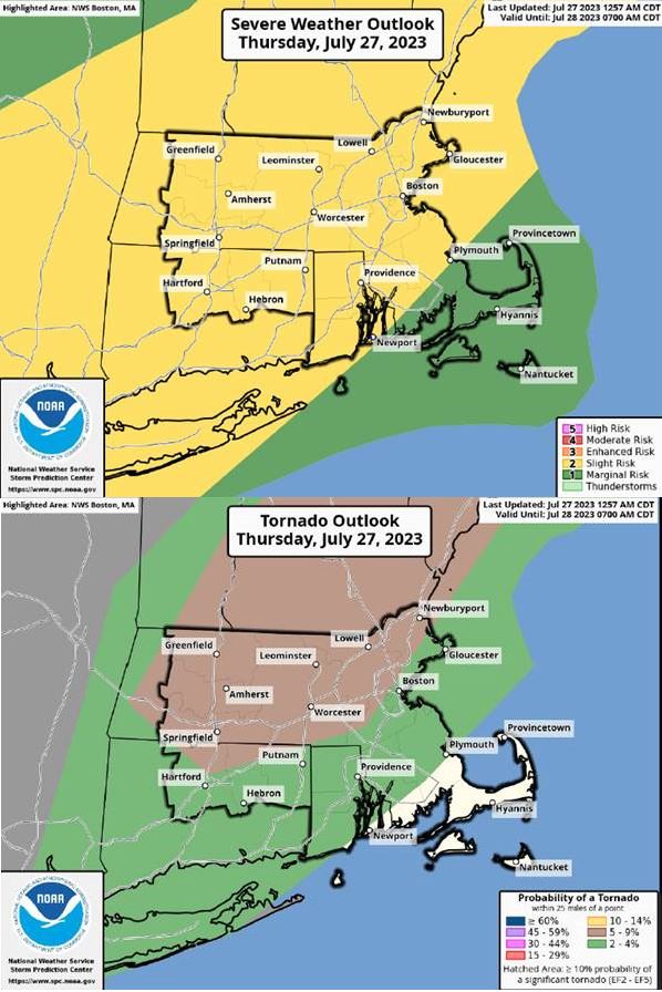 The National Weather Service (NWS) in conjunction with the Agency Meteorologist is forecasting a high impact, multi-faceted weather event for Massachusetts today from 12:00 PM to 9:00 PM. There are several hazards forecasted that include the possibility for tornadoes, straight line wind damage, strong to severe thunderstorms, and  flooding rains. Those with outdoor plans today should heed extra caution, as conditions may change quickly.