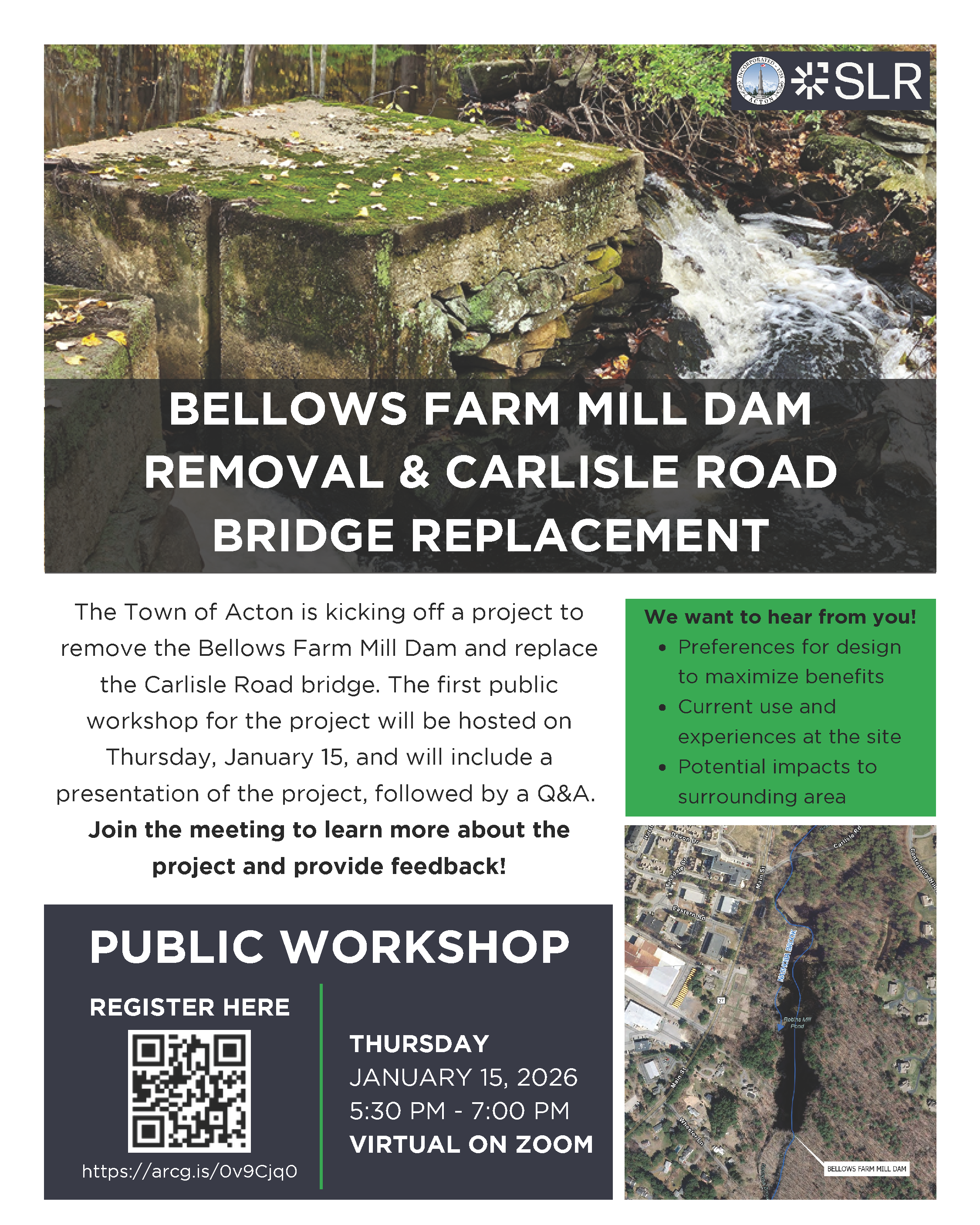 The Town of Acton is kicking off the removal of the Bellows Farm Mill dam and replacement of the Carlisle Road bridge. The Town will host the first public workshop for the project on Thursday, January 15 from 5:30 PM to 7:00 PM. Scan the QR code to visit the  project website and register for the event to receive meeting details.