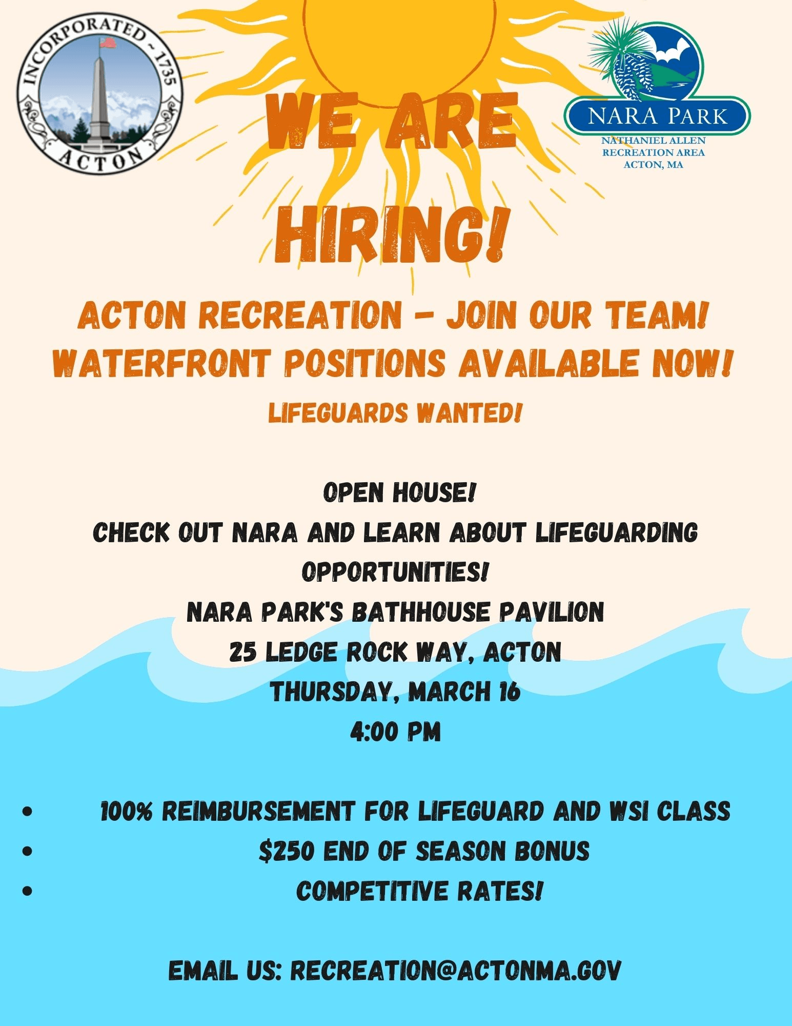 The Town of Acton is seeking Lifeguards for the summer. For anyone interested in working with the Acton Recreation department and becoming a lifeguard, please visit our open house on Thursday March 16th at 4pm at Nara Park Bathhouse Pavilion. The Recreation department is offering a 100% reimbursement for lifeguard and WSL classes and $250  for the end of season bonus! For more information please email recreation@actonma.gov.